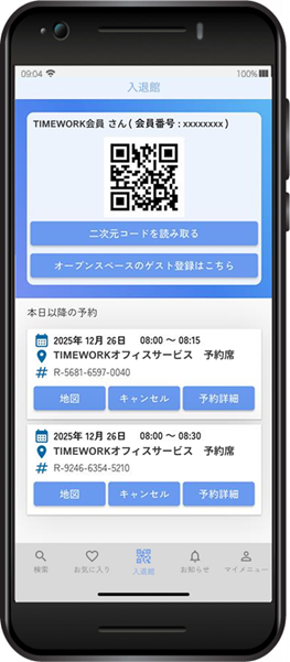 管理者の承諾後、利用者は予約番号をご提示いただく、または受付に設置されている二次元コードを読み取っていただくことで、施設を利用できます。